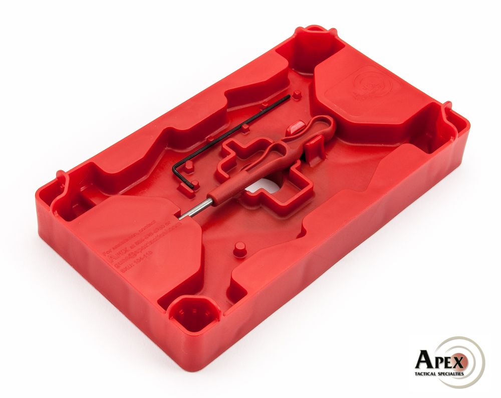 Raised surface in the center catches the muzzle during slide back plate removal, protecting your bench from scratches or dings. Small bumps on the lowered surface retain the included 1/16” Allen wrench, so you always have it handy. Grasping fingers on the side provide secure storage for the Apex Heavy Duty Armorer’s Punch (included), so your punch stays put between uses.