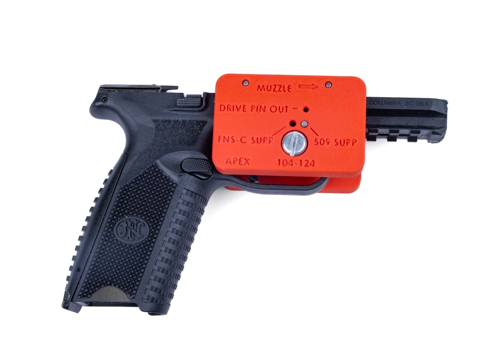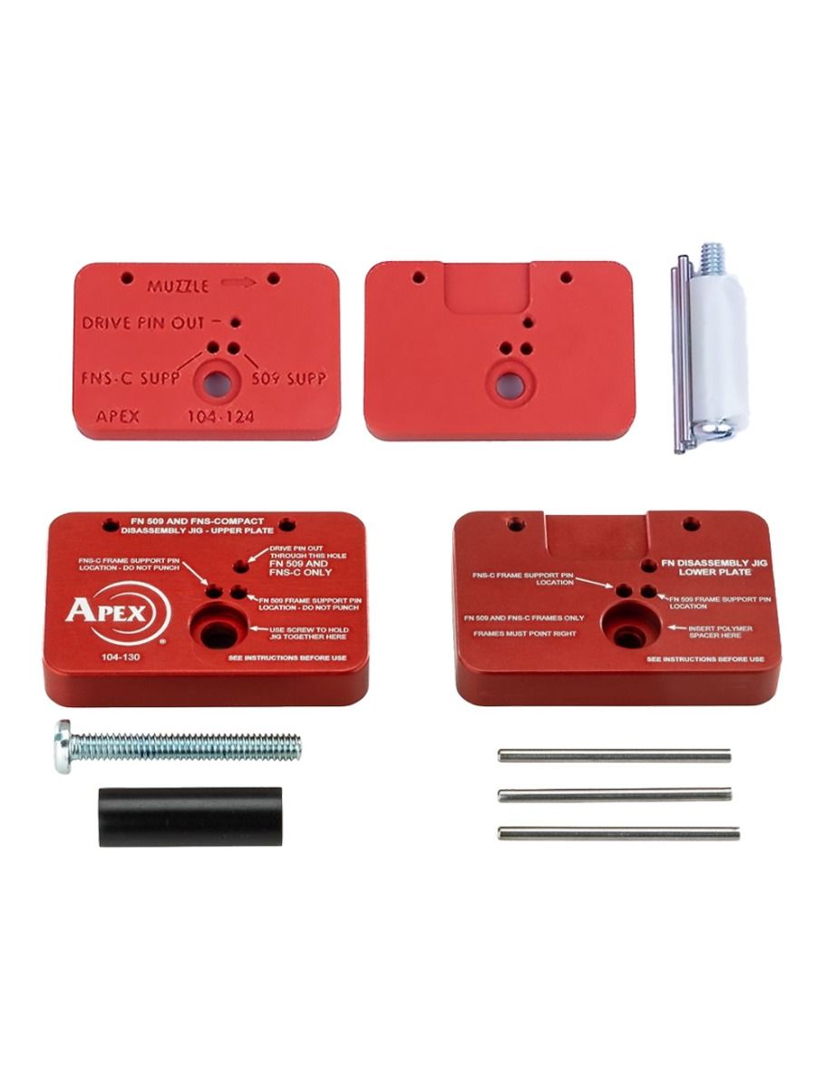 That pin is notorious for being stubborn, especially after exposure to high temperatures, sand, and carbon fouling. This fixture holds your FN 509 or FNS Compact frame securely and precisely locates a pin punch directly over the unlocking block pin. No more slipping punches, no more marred frames, no more frustration in the middle of a cleaning or repair job.