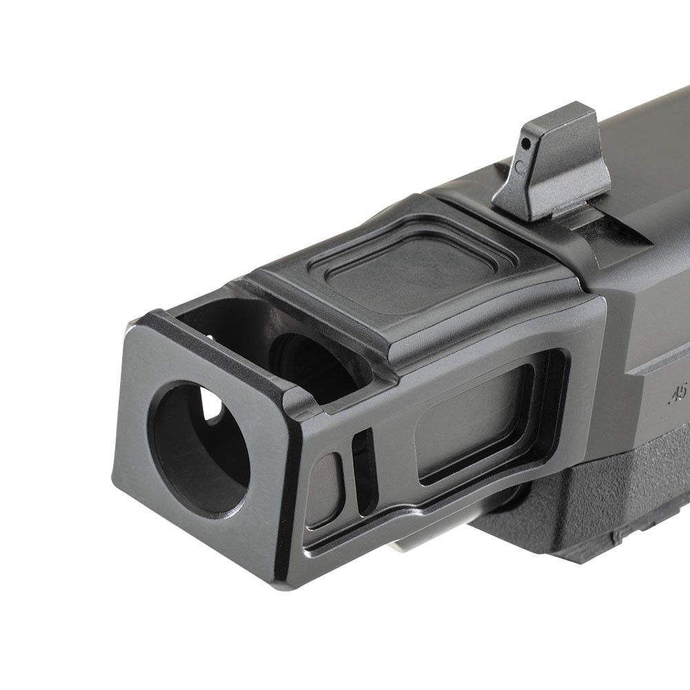 • Streamlined look — wings on the compensator body bridge the gap between slide and comp, giving the pistol a clean, integrated profile that sheds dust and debris.