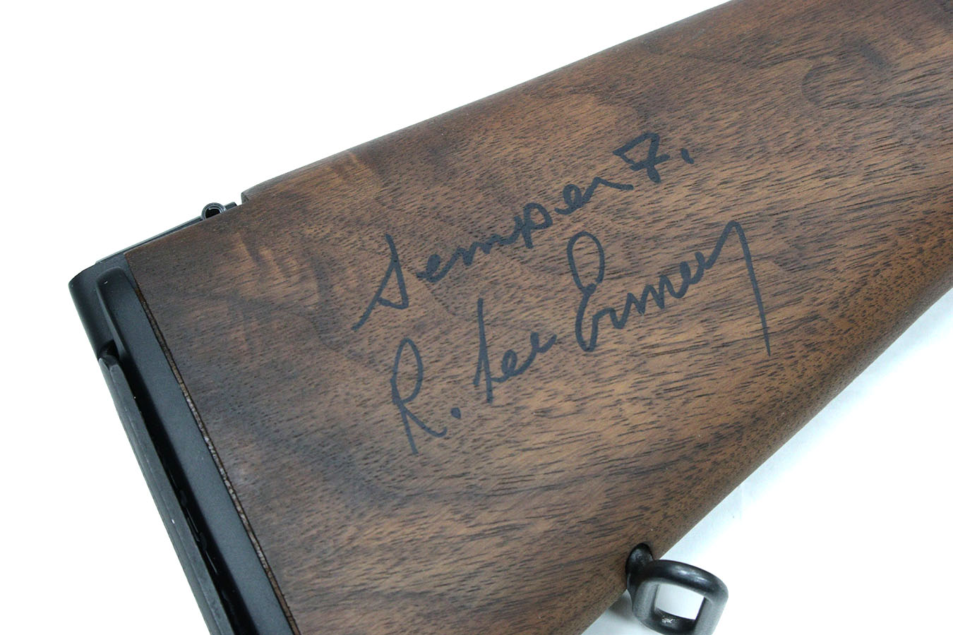 - Stock: Walnut with a hand-signed R. Lee Ermey signature on the right side, protected by a light coat of oil; stock shows minor dings and handling marks from field use