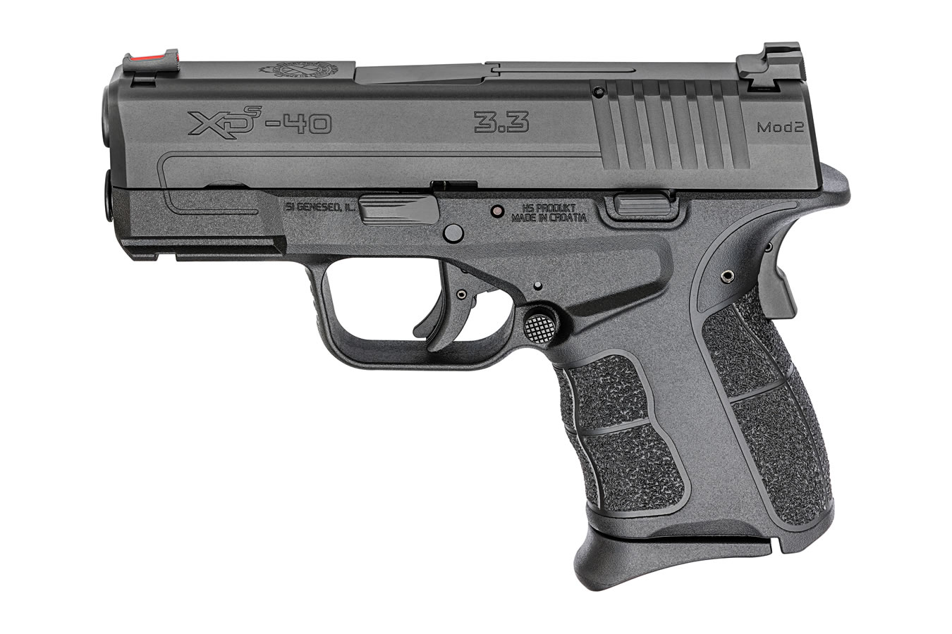 This springfield xds mod.2 40 s&w 3.3 single stack pistol with fiber optic front sight is built for defensive use. The .40 S&W chambering offers proven terminal ballistics while the single-stack magazine keeps the grip thin for discreet carry. The fiber optic front sight stands out clearly against the serrated rear sight for fast front-sight focus.